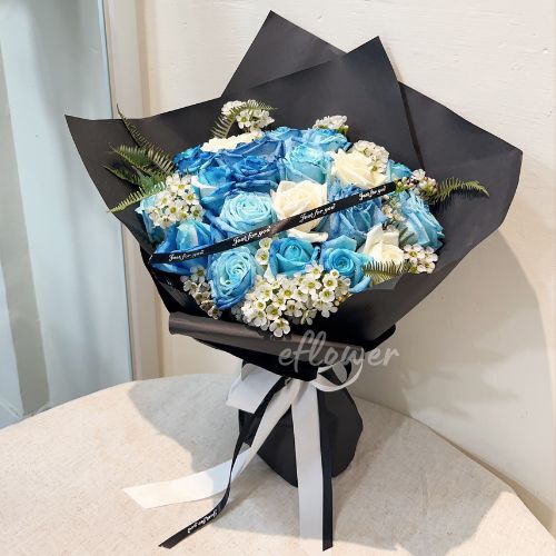 使用花材:藍、白玫瑰共20朵、蠟梅